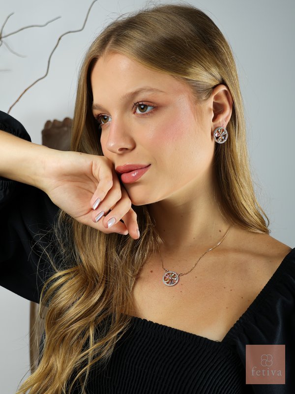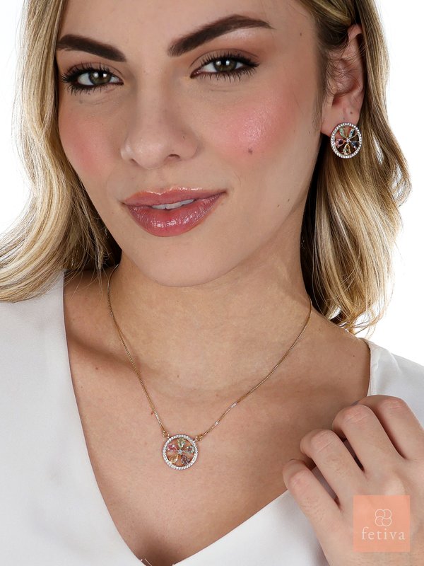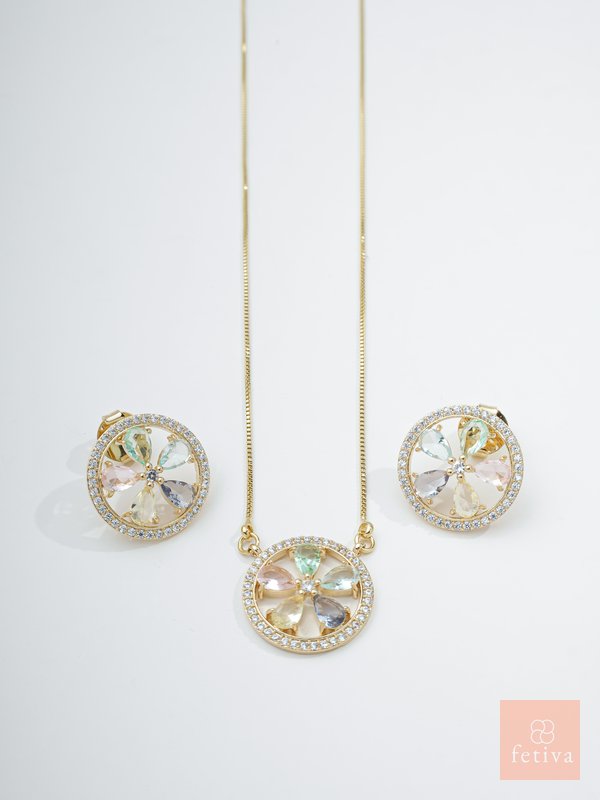 Surrounded by a sparkling zirconia halo, the necklace and matching earrings exude elegance and charm, perfect for adding a touch of color and sophistication to any look.